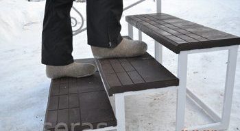 Ступень изготавливается из полимерпесчаного композита. Она обладает долговечностью, ударопрочностью, не впитывает воду, не теряет цвета.