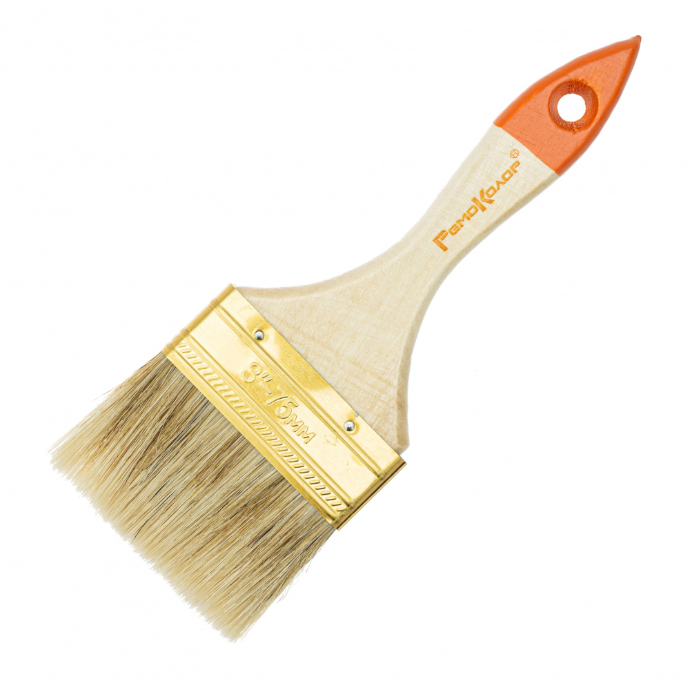 Натуральная светлая щетина. Металлическая оцинкованная оправка. Деревянная лакированная ручка. ТОПС 50%. Ширина кисти 75 мм Толщина кисти 10 мм Длина щетины 44 мм