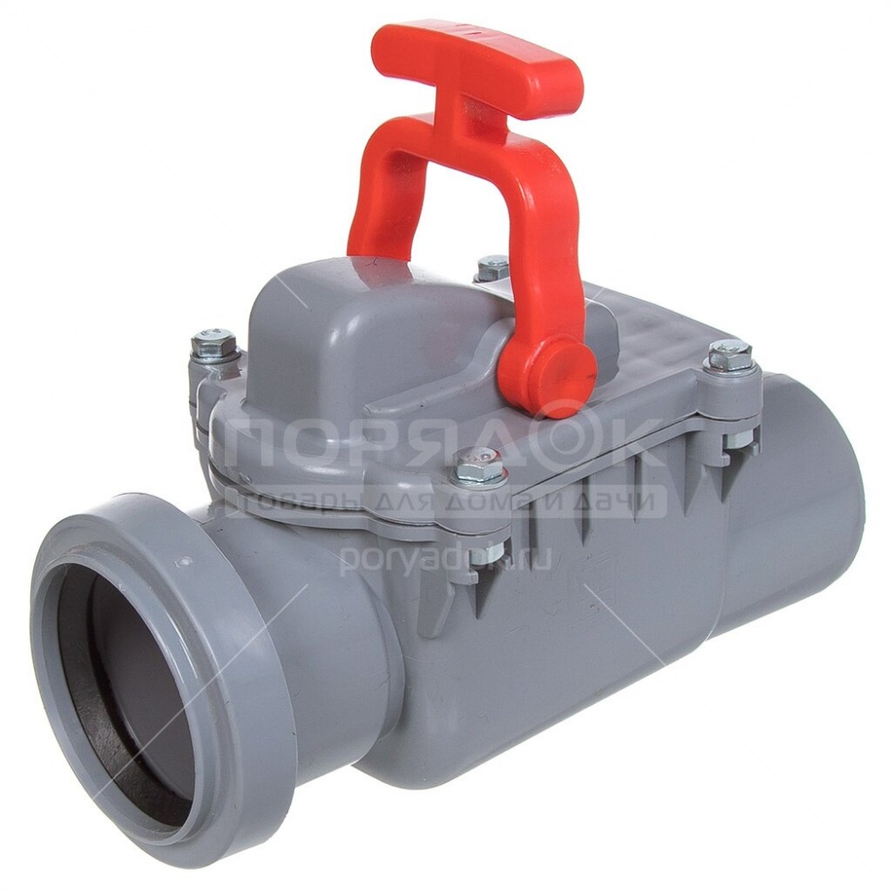 Клапан обратный канализационный с запирающей заслонкой из профилированной нержавеющей стали с язычковым уплотнением, с ревизионной крышкой и присоединительными выходами под раструбные трубы ПП, ПВХ, с возможностью фиксации заслонки в закрытом состоянии при помощи ручного фиксатора с предохранителем от самопроизвольного закрытия. Устанавливается строго горизонтально - либо в подвале здания (перед выходом внутренней канализационной магистрали во внешнюю), - либо в приямке снаружи здания. Таким образом, клапан канализационный отделяет внутреннюю канализационную сеть здания от внешней канализационной сети. Входной и выпускной патрубки клапана предназначены для соединения с любой канализационной раструбной трубой из ПП или ПВХ.