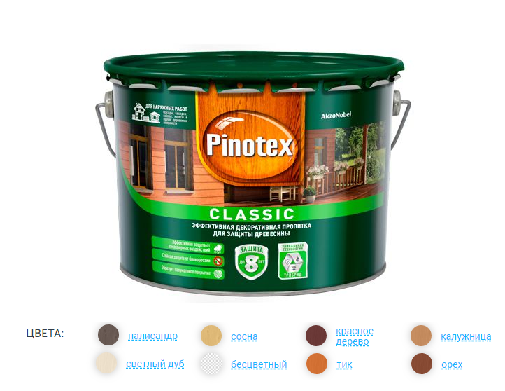 Связующее защитной пропитки Pinotex Classic разработано с использованием технологии AWB. Пропитка Pinotex Classic легко наносится и быстро впитывается в поверхность древесины, образуя полуматовую пленку с высокими декоративными и защитными свойствами. Содержит активные добавки против плесени и синевы, защищает деревянные конструкции от биокоррозии. Защитную пропитку Pinotex Classic рекомендуется применять в системе с грунтовкой Pinotex Base.